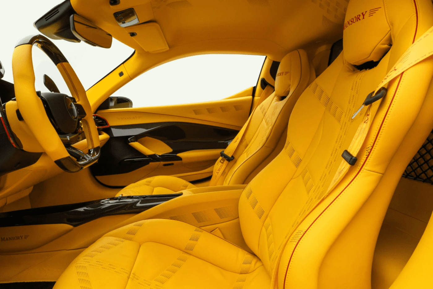 However, it’s inside where Mansory’s craftsmanship truly shines. The interior is meticulously adorned with lavish yellow leather from top to bottom, creating a stunning contrast to the matte black exterior.